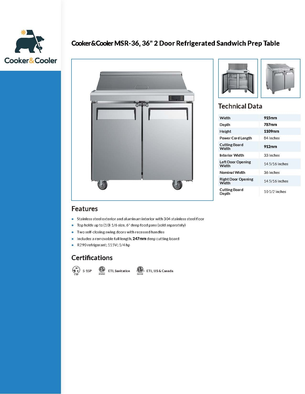 36" 2 Door Refrigerated Sandwich Prep Table, MSR-36