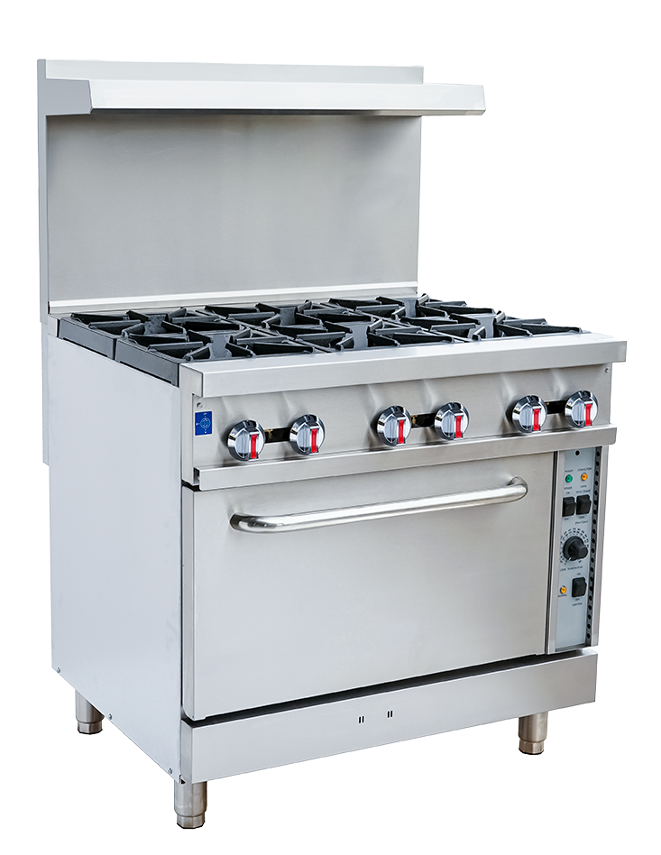 • SGR-6B-24RG – 6 Open top burners, 1 raised griddle/broiler, 2 oven