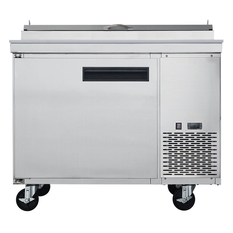 The Chef AAA APP44-6-S1 commercial pizza prep table is constructed of heavy-duty stainless steel to be durable and resilient to harsh kitchen environments. Keeps toppings and ingredients insulted with a hinged cover. Includes 6 1/3 pan containers to keep food organized and ready to use. The bottom conveniently holds additional items with a removable wire shelf that can be adjusted. With a range of 33°F to 41°F, it chills and safely stores all types of food. Digital temperature controls and LED display lets you precisely pick the desired temperature. Designed with a bottom-mounted 1/7 HP compressor for efficiency.