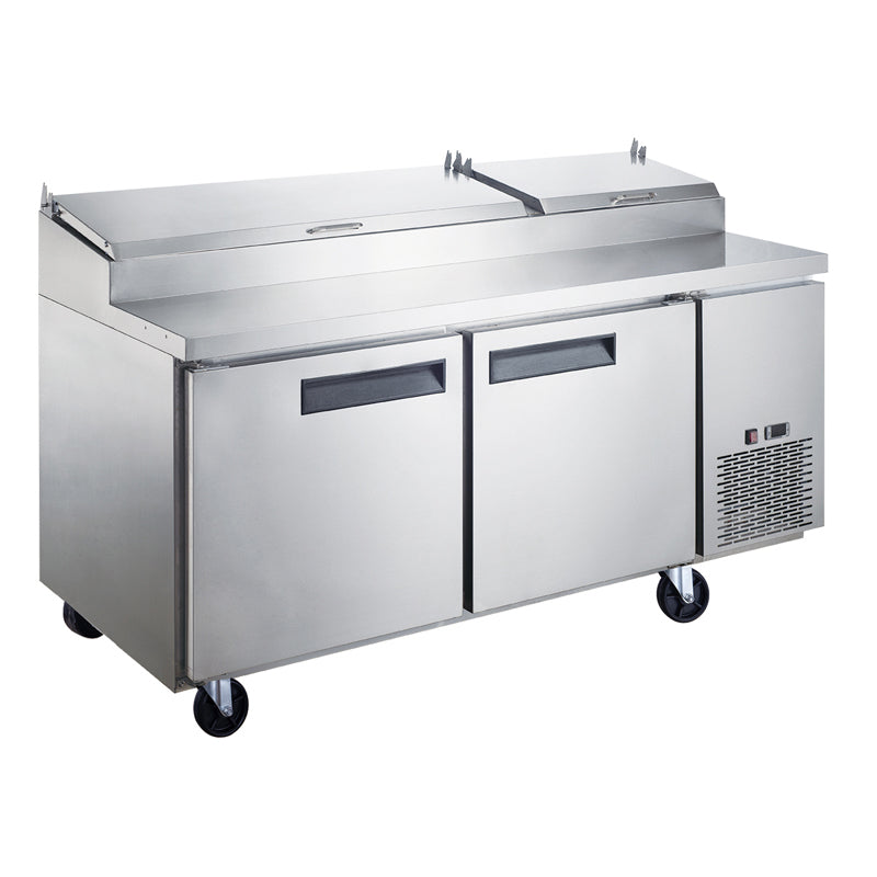 The Chef AAA APP70-9-S2 commercial pizza prep table is constructed of heavy duty stainless steel to be durable and resilient to harsh kitchen environments. Keeps toppings and ingredients insulted with a hinged cover. Includes 9 1/3 pan containers to keep food organized and ready to use. The bottom conveniently holds additional items with 2 removable wire shelves that can be adjusted. With a range of 33°F to 41°F, it chills and safely stores all type of food. Digital temperature controls and LED display lets you precisely pick the desired temperature. Designed with a side mounted 1/4 HP compressor for efficiency.