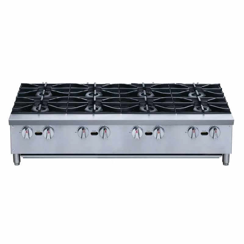 The Chef AAA ACHPA48 hot plate with 4 burners features 28,000 BTUs and works with natural gas or liquid propane. Stainless steel exterior and interior 28000 BTU stainless steel burners with standby pilot Liftoff cast iron burner Independent manual controls every 12” Cool-to-the-touch” front s/s edge Each hot plate is shipped with Standard Natural Gas, LP conversion kit Adjustable, stainless steel legs standard Full length seamless drip pan, easy to remove and clean Catch Tray is included Chef AAA ACHPA48 Eight Lift-Off Burner Hot Plate- Natural Gas - Commercial Use.