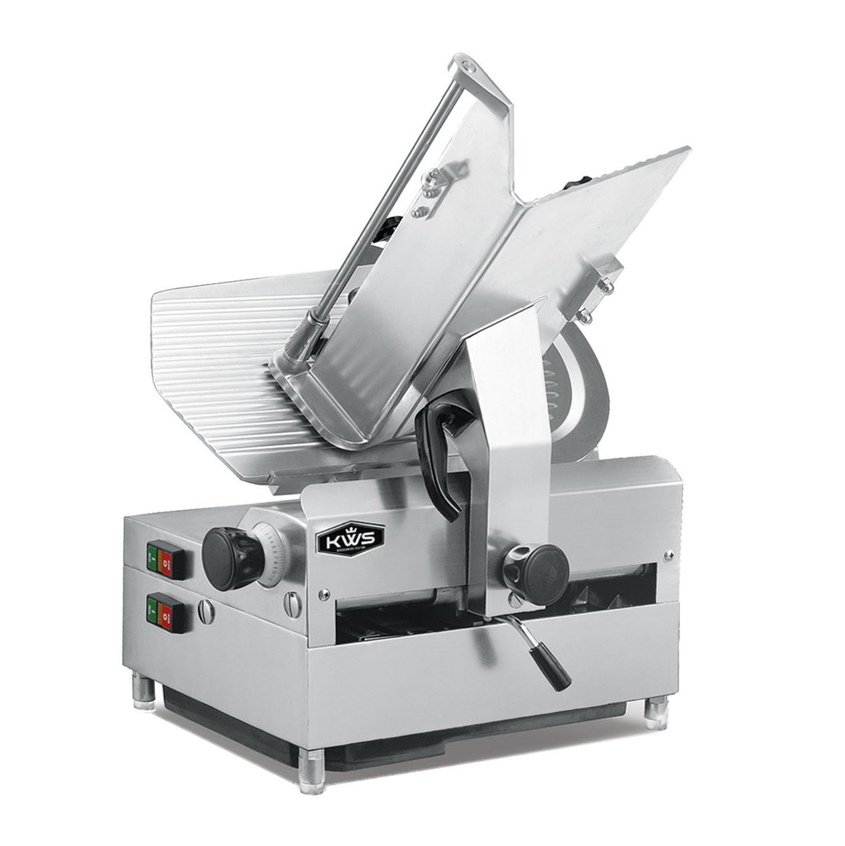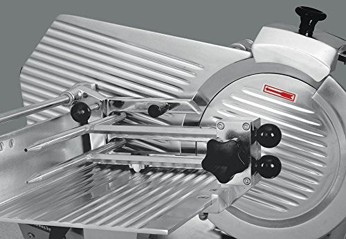 The product tray of our KWS MS-12A meat slicer is mounted at a 45 degree angle, which uses gravity to better hold the product against the knife so you apply less pressure while ensuring a more consistent product. The product tray of our KWS MS-12A slicer can hold foods up to 10″ (L) X 15.5″ (W) X 8″ (H), the adjustable horizontal clamps secure irregular shaped products for precise slicing, allowing you to slice any produce large or small your heart desires.