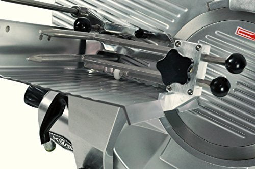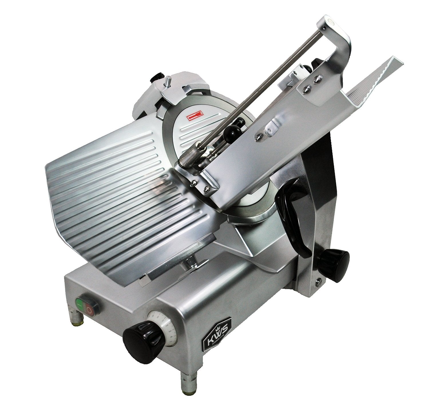 The product tray of our KWS MS-12HP meat slicer is mounted at a 45 degree angle, which uses gravity to better hold the product against the knife so you apply less pressure while ensuring a more consistent product. The product tray of our KWS MS-12HP slicer can hold foods up to 8.5″ (L) X 14″ (W) X 8″ (H).