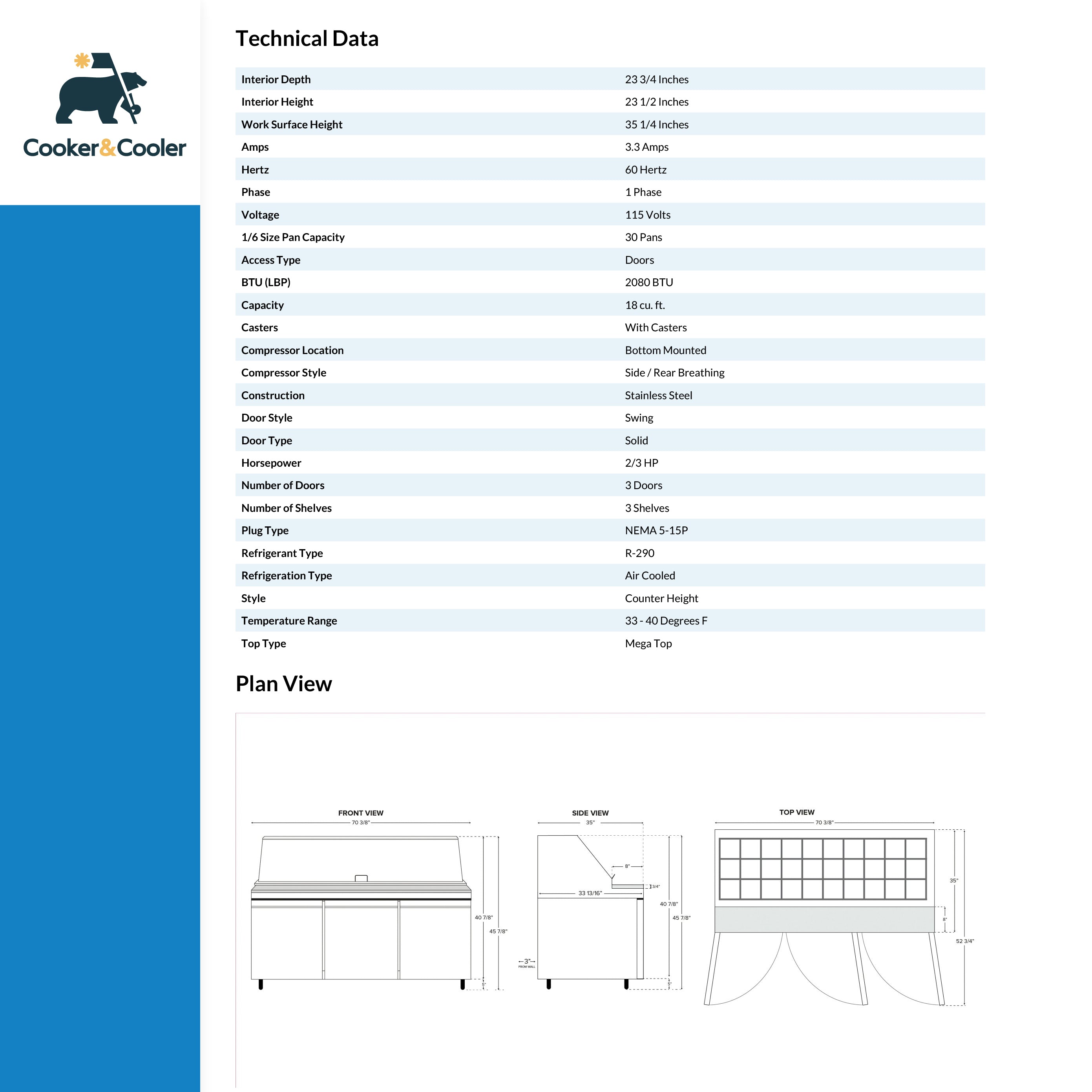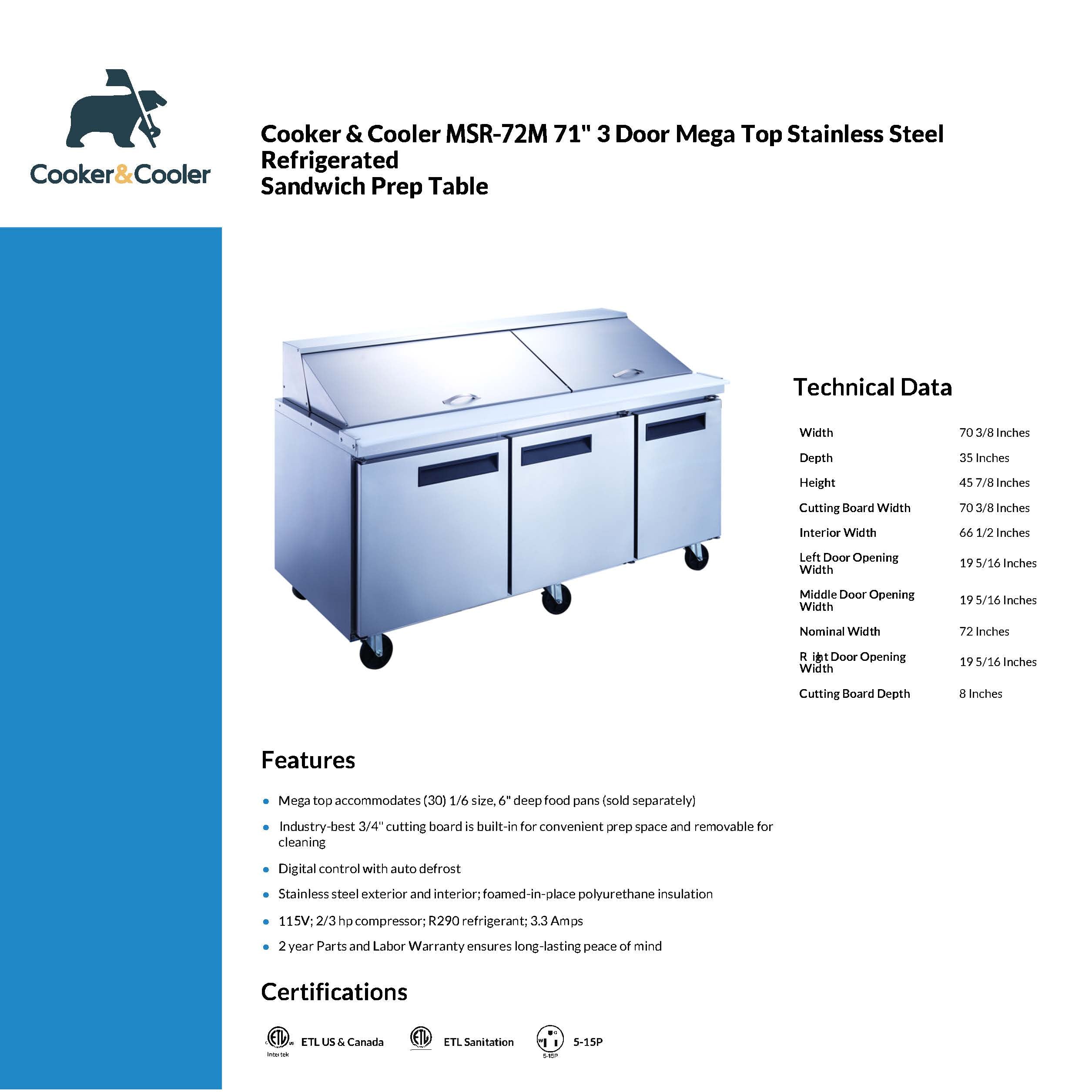 MSR-72M Mega Top Refrigerated Sandwich Prep Table, 72"*35"*46", 3-Year labor 5-Year Parts 10-Year compressor