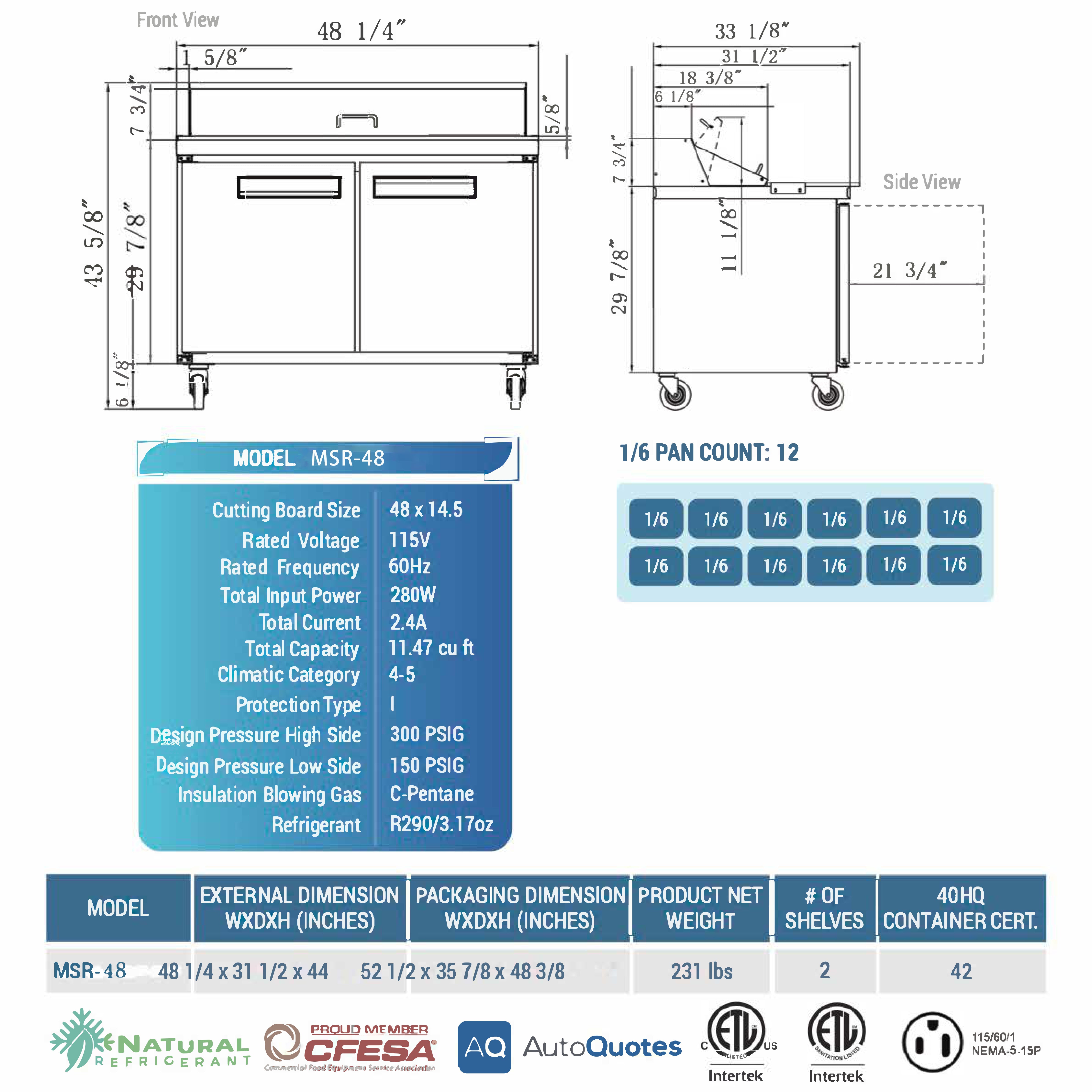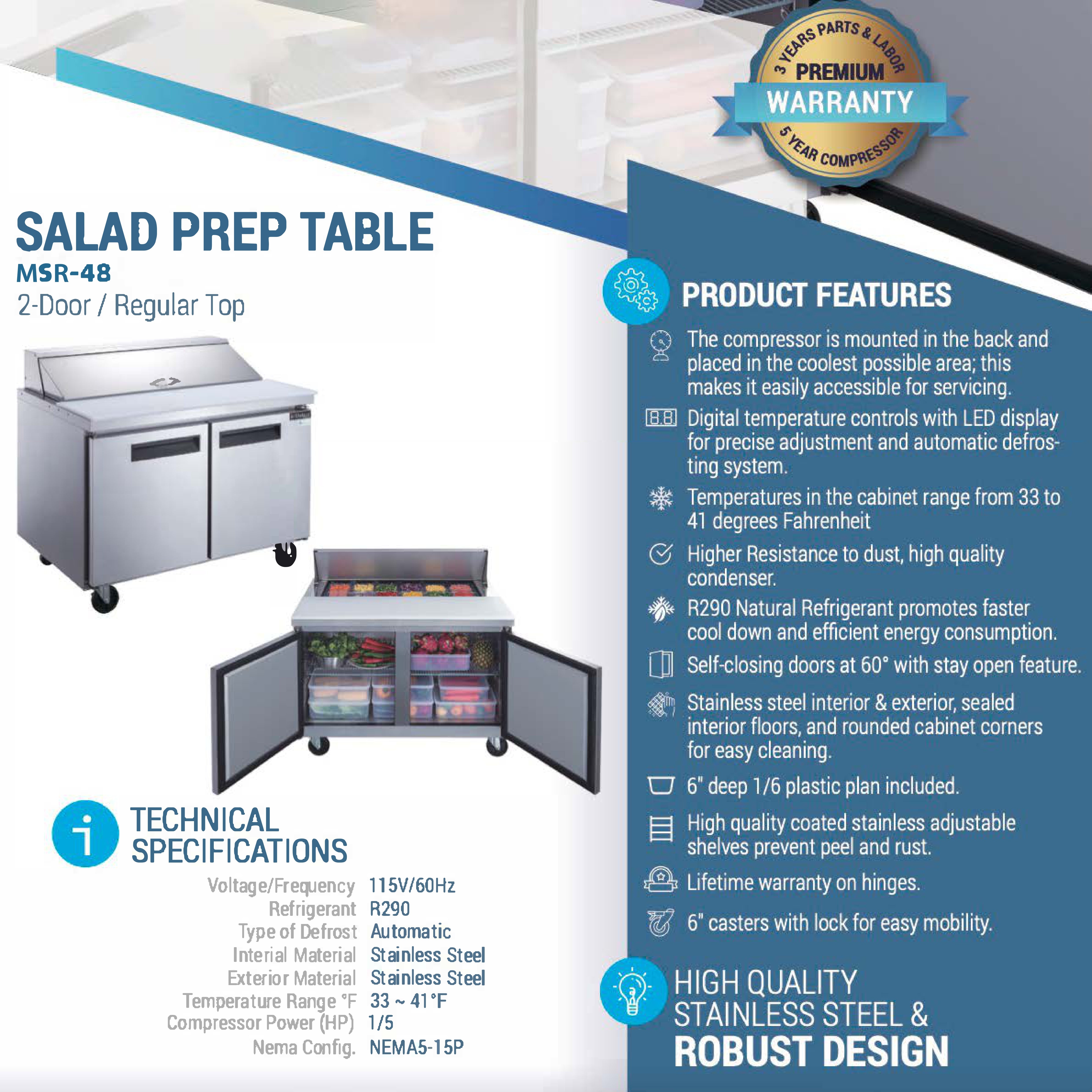 MSR-48 Refrigerated Sandwich Prep Table, 48"*31"*44", 3-Year labor 5-Year Parts 10-Year compressor