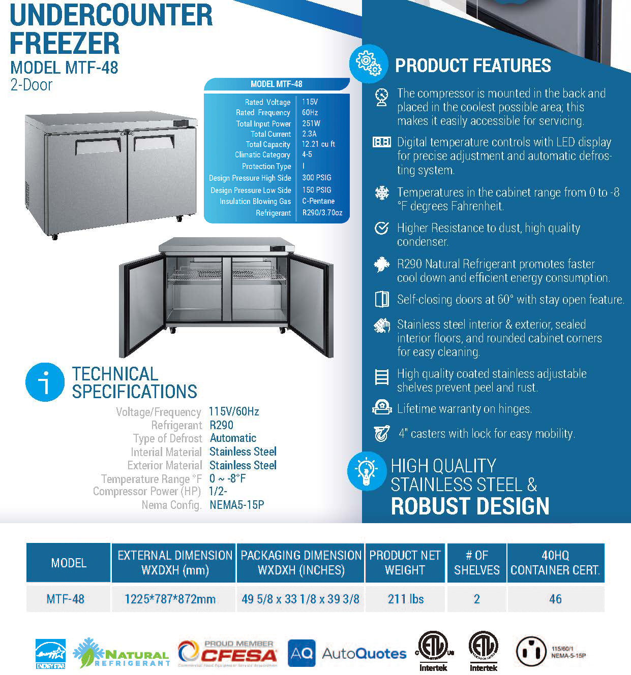 MTF-48 Undercounter Commercial Freezer, 48“*31"*34"*, 3-Year labor 5-Year Parts 10-Year compressor